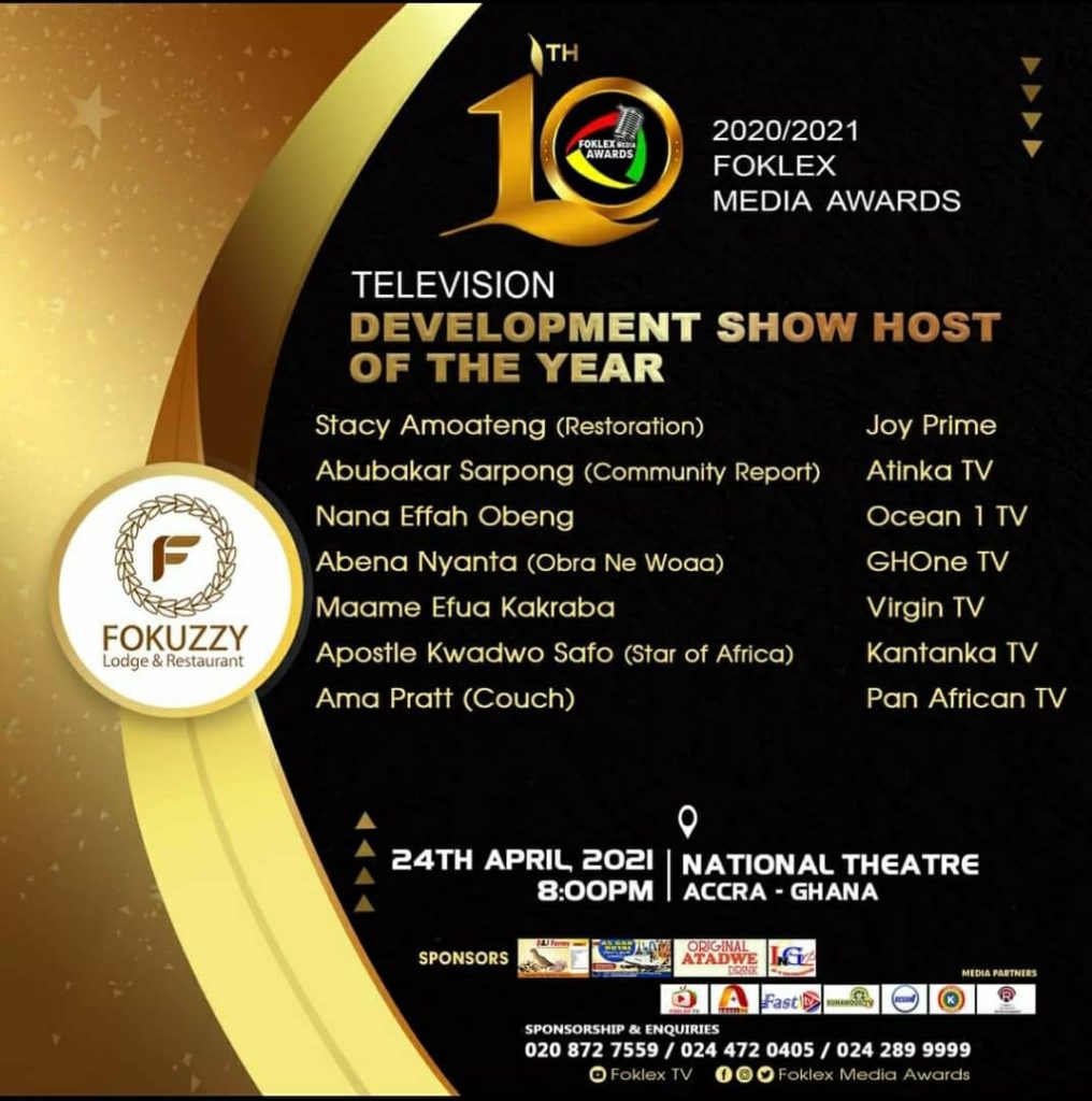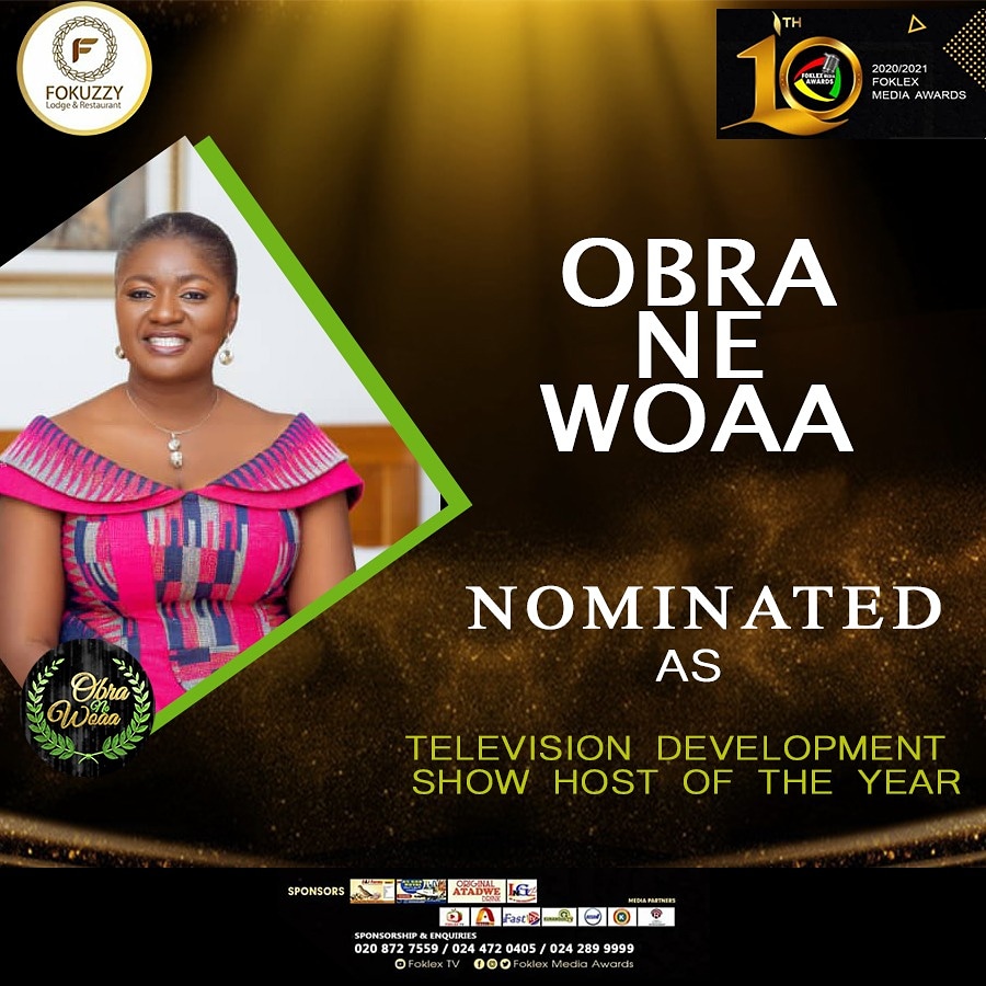 The good news is, after the production of two fruitful and impactful seasons and weekly exhibition on Ghana’s loudest GhOne Tv, “Obra Ne Woa” has gained some trust in the media space as the affable and vivacious presenter of the show in the person of Madam Abena Nyanta has been nominated in the “Television Development Show Host Of The Year” category at the prestigious Foklex Media Awards 2021.